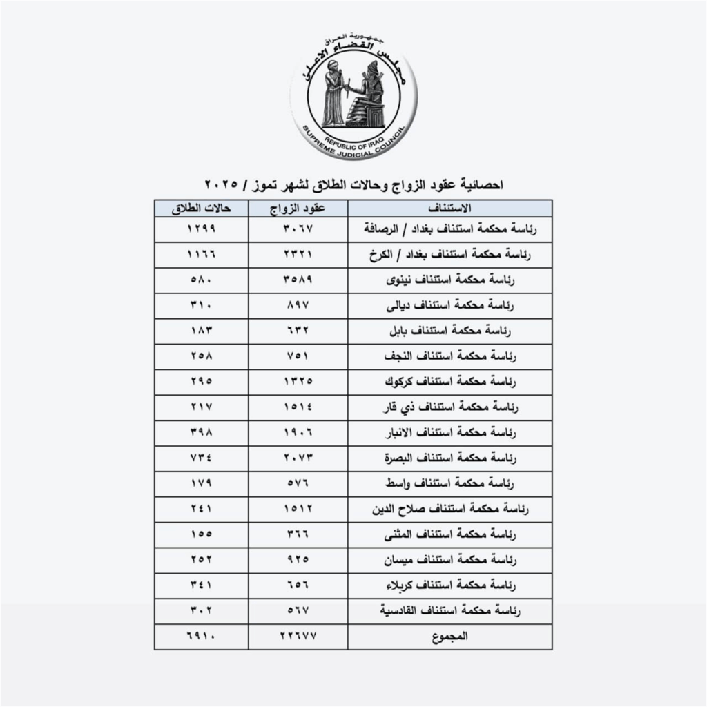 نشر مجلس القضاء الأعلى، اليوم الاحد، إحصائية رسمية باعداد حالات الزواج والطلاق لشهر تموز الماضي، فيما تصدر محكمة استئناف بغداد ـ الرصافة بعدد حالات الطلاق لتبلغ 1299 حالة طلاق.