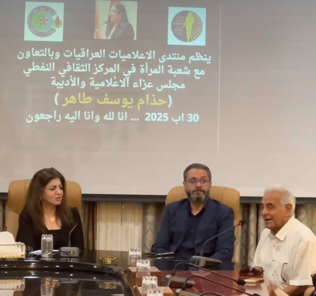 نظم منتدى الإعلاميات العراقيات، بالتعاون مع شعبة المرأة في المركز الثقافي النفطي، يوم السبت الموافق 30 آب، مجلس عزاء للراحلة الزميلة حذام يوسف طاهر، بحضور عائلتها ونخبة من الشخصيات الثقافية والمجتمعية.