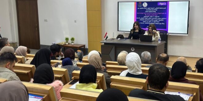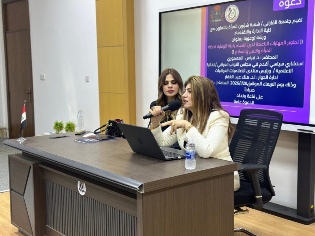 قدّمت الدكتورة نبراس المعموري، رئيسة منتدى الإعلاميات العراقيات، محاضرة علمية متخصصة حول القوة الناعمة ودورها في بناء السلام، استهدفت مجموعة من طالبات وطلبة جامعة الفارابي من مختلف التخصصات، وذلك بتنظيم من شعبة شؤون المرأة وبالتعاون مع كلية الإدارة والاقتصاد في الجامعة.
