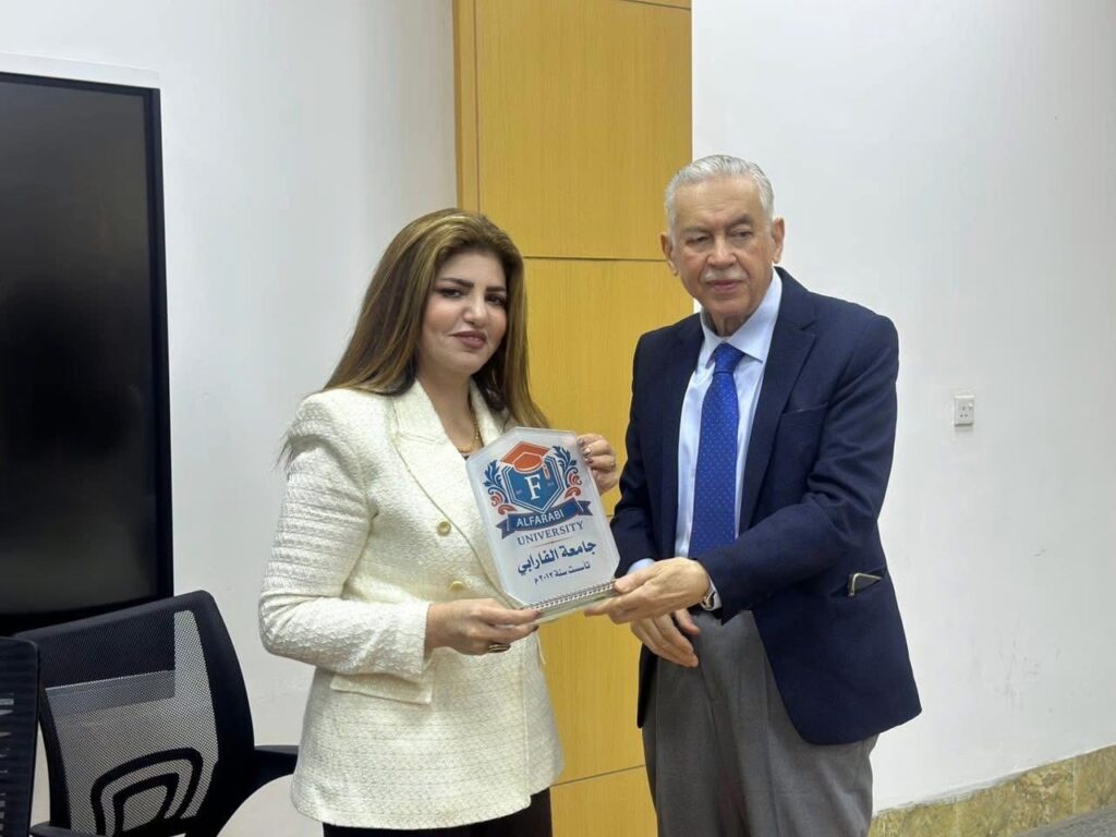 واختُتم النشاط بتكريم الدكتورة نبراس المعموري، حيث مُنحت شهادة شكر وتقدير إضافةً إلى درع جامعة الفارابي، قدّمه عميد كلية الإدارة والاقتصاد، تقديرًا لجهودها العلمية ومساهمتها المعرفية المتميزة.