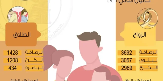 أعلن مجلس القضاء الأعلى في العراق، يوم الثلاثاء، تسجيل 27 ألفاً و256 عقد زواج مقابل 5 آلاف و999 حالة طلاق في عموم محاكم الاستئناف خلال شهر كانون الثاني 2026.